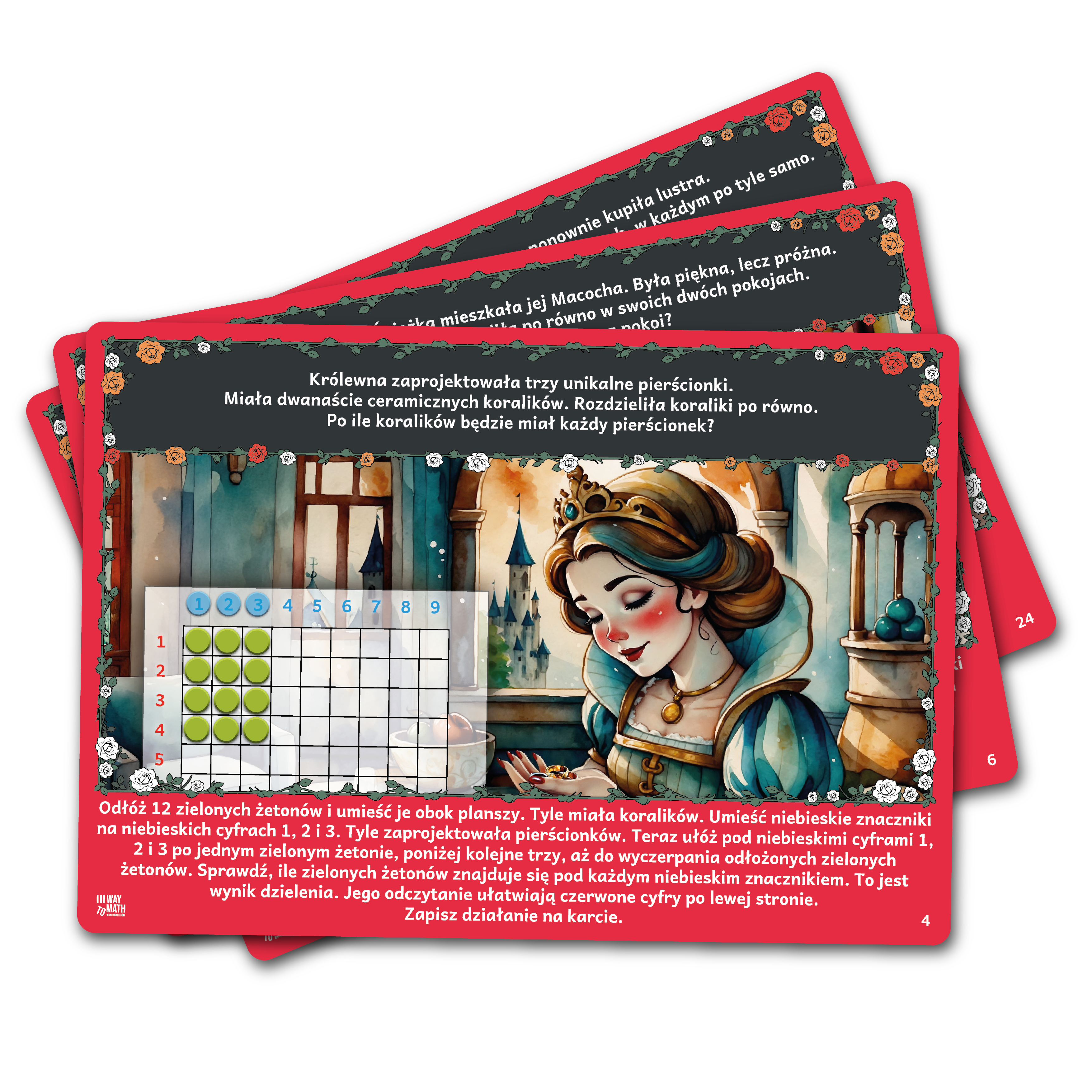 Dzielenie z Królewną Śnieżką przenosi dzieci w piękny świat bajki, gdzie nauka dzielenia staje się ekscytującą przygodą. Dzięki kartom edukacyjnym najmłodsi pomagają Królewnie Śnieżce i jej przyjaciołom w rozwiązywaniu różnych matematycznych wyzwań, odkrywając tajemnice dzielenia.
