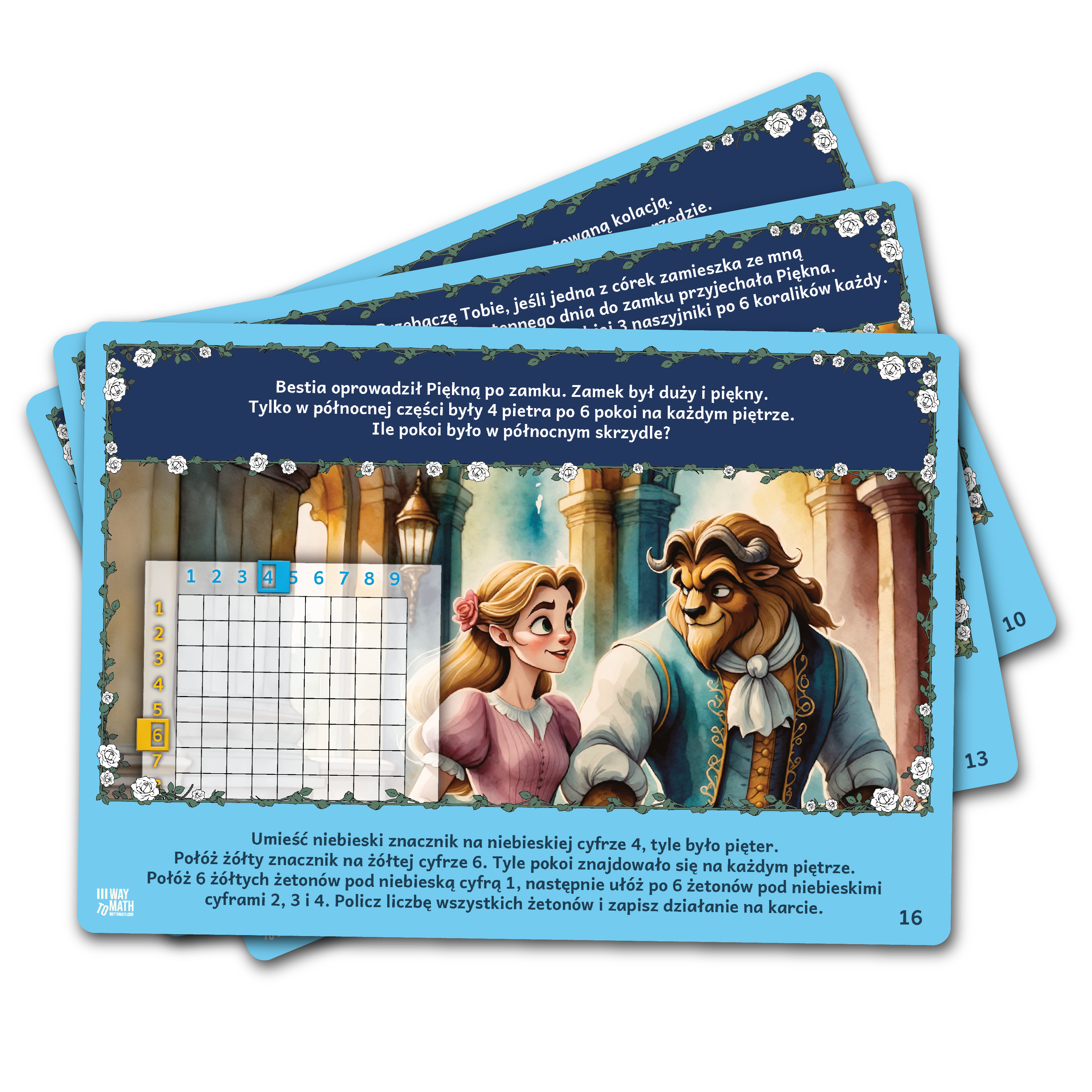 MATEMATYKA MNOŻENIE Z PIĘKNĄ I BESTIĄ przenosi dzieci w wyjątkowy świat Pięknej i Bestii, gdzie nauka mnożenia staje się fascynującą przygodą. Dzięki kartom edukacyjnym najmłodsi odkrywają tajemnice matematyki, pomagając bohaterom bajki w rozwiązywaniu różnych wyzwań. Każda karta to nowe zadanie, które rozwija umiejętność mnożenia.