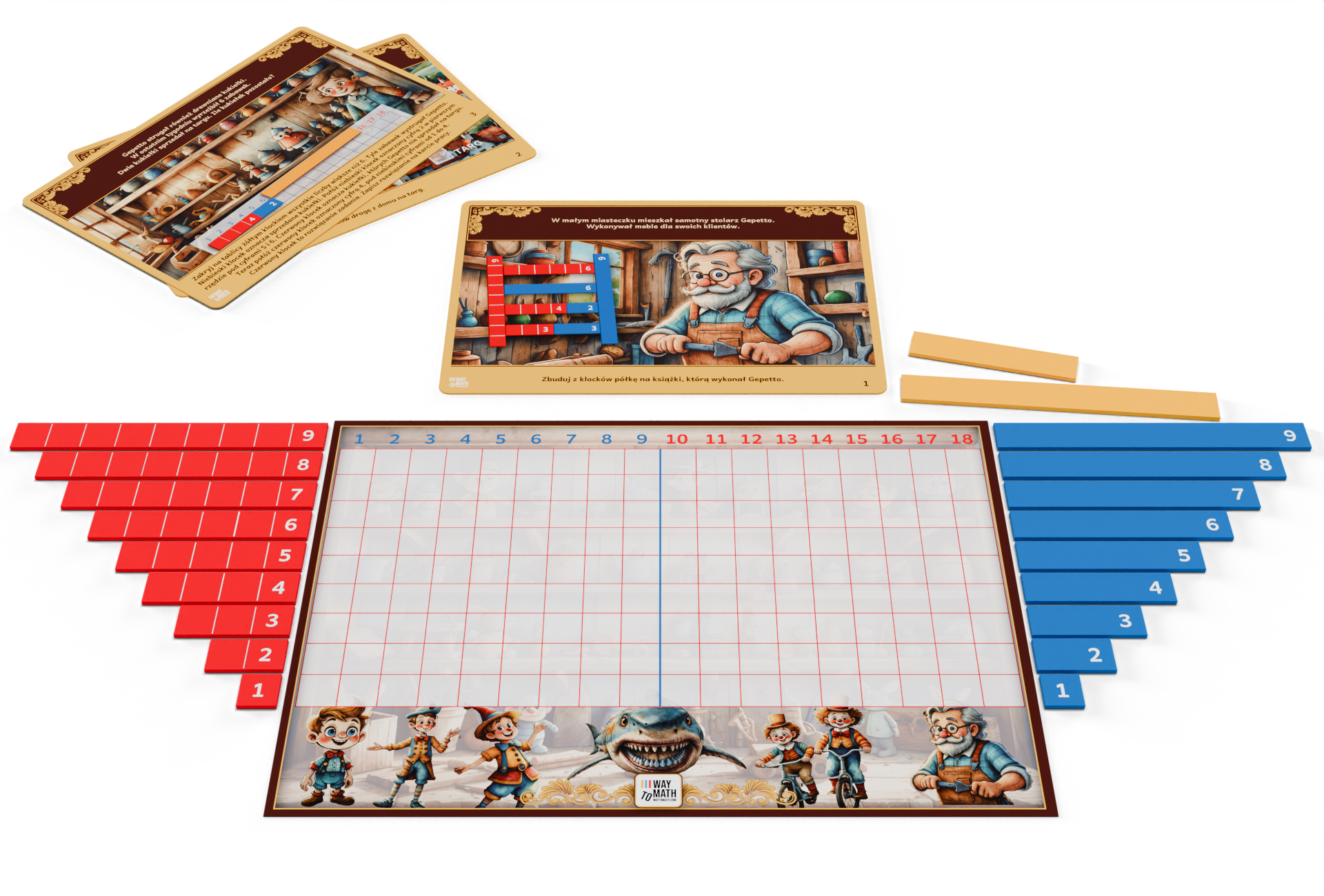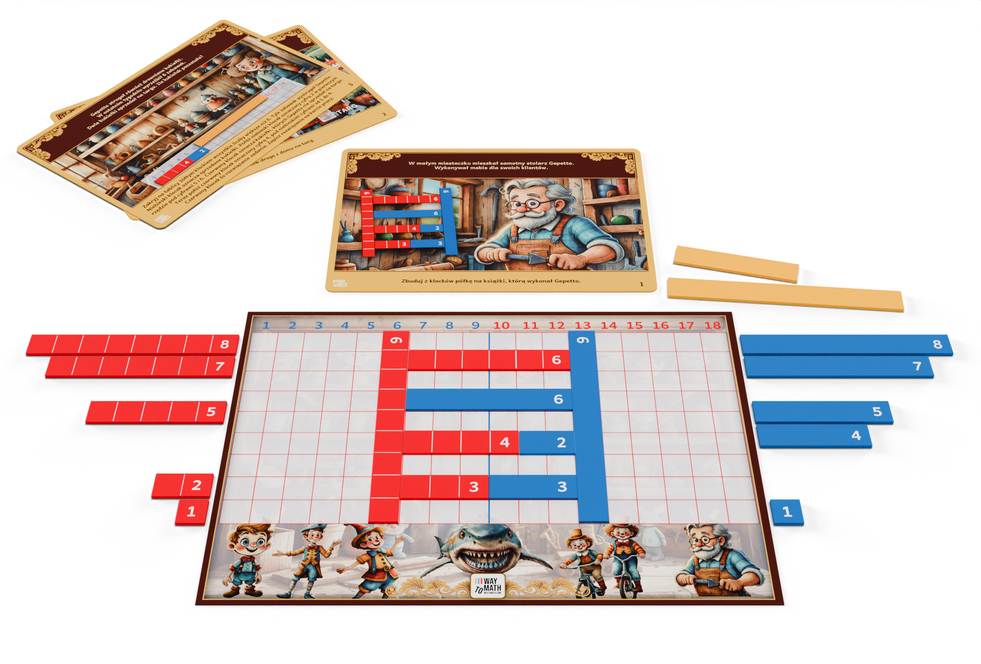 Klocki: 3 zbiory klocków, jeden czerwony, drugi niebieski, trzeci żółty; na klockach czerwonych i niebieskich nadrukowane są cyfry od 1 do 9; listwy czerwone podzielone są pionowymi liniami na kwadraty;